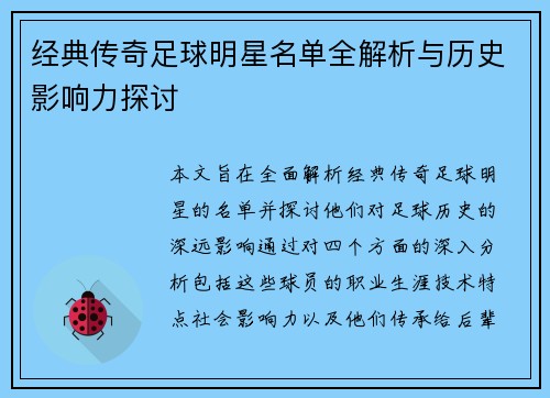 在足球的世界中,明星球员不仅凭借他们的技术和才华吸引了无数球迷,更通过他们的传奇故事与成就成为人们心目中的偶像。本文将探讨如何通过谐音数字来解读这些足球明星的传奇故事及其伟大成就。我们将从四个方面深入分析:谐音数字背后的文化意义、著名足球明星及其相关数字、数字对公众形象的影响以及如何利用这些数字激励下一代球员。通过这些方面,我们希望能够更全面地了解足球明星们所代表的精神和价值,同时也为球迷们提供一...